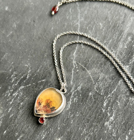 Dendritic Agate and Garnet Sterling Silver Necklace by Kate Wells Crooked River Jewelry